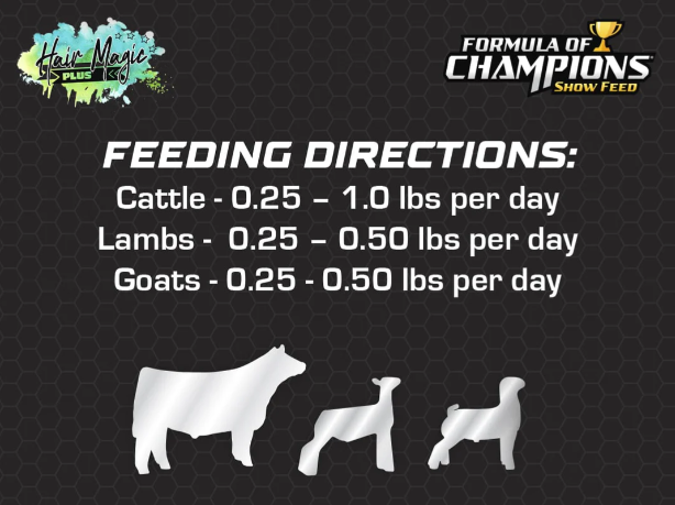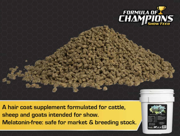 A hair coat supplement formulated for cattle, sheep and goats intended for show.