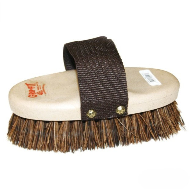 The Decker™ #90 "The Classic" Grip-Fit Brush is designed for comfortable and efficient grooming. Featuring a tan block with a dark brown web strap, it offers a secure and ergonomic grip. The 1-3/8" Palmyra fiber trim ensures thorough cleaning, while the 7-5/8" length provides the perfect balance of control and coverage. Made in the USA, this brush combines durability with timeless style.