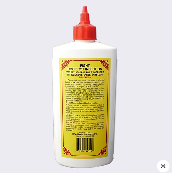 - Slowly squirt Dr. Naylor Hoof 'N Heel on lesion, covering and saturating it and surrounding area thoroughly while holding hoof inverted -permit it to penetrate before releasing animal. Foot may be wet pk. bandaged or soaked to enhance healing. Hoof n Heel is re-usable and stable.