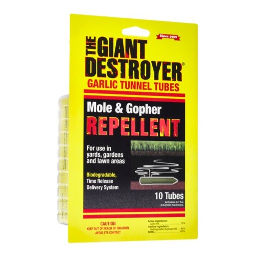 Use THE GIANT DESTROYER garlic tunnel tubes to safely repel moles and gophers from your yard and garden. Each tube consists of highly concentrated garlic oil and is for use in yards, gardens and lawn areas.
