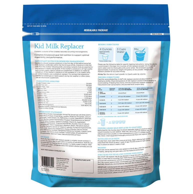 Sav-A-Kid® Milk Replacer is a complete and balanced nutrition designed to support the overall wellness and growth of goat kids. An all-milk protein formula with a blend of vitamins, minerals, and organic selenium, Sav-A-Kid® gives your young ones the strong start they deserve.