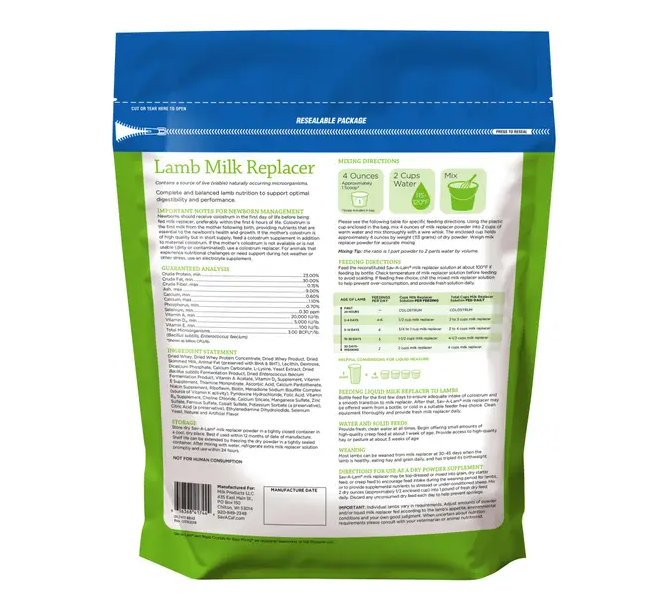 A nutritionally balanced milk replacer specially fortified with vitamins and minerals with protein levels comparable to ewe’s milk. Contains 100% all-milk proteins for superior digestibility and is 100% instantized for easy mixing. Specially formulated for bottle-feeding or can be top dressed for free choice feeding from birth to weaning. Mix 4 oz. with one pint of warm water.